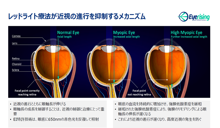 赤色光が瞳孔を通って眼底に届き、眼底の血流を促進することで、眼軸の伸びを緩やかにし、近視の進行を抑えると考えられております。